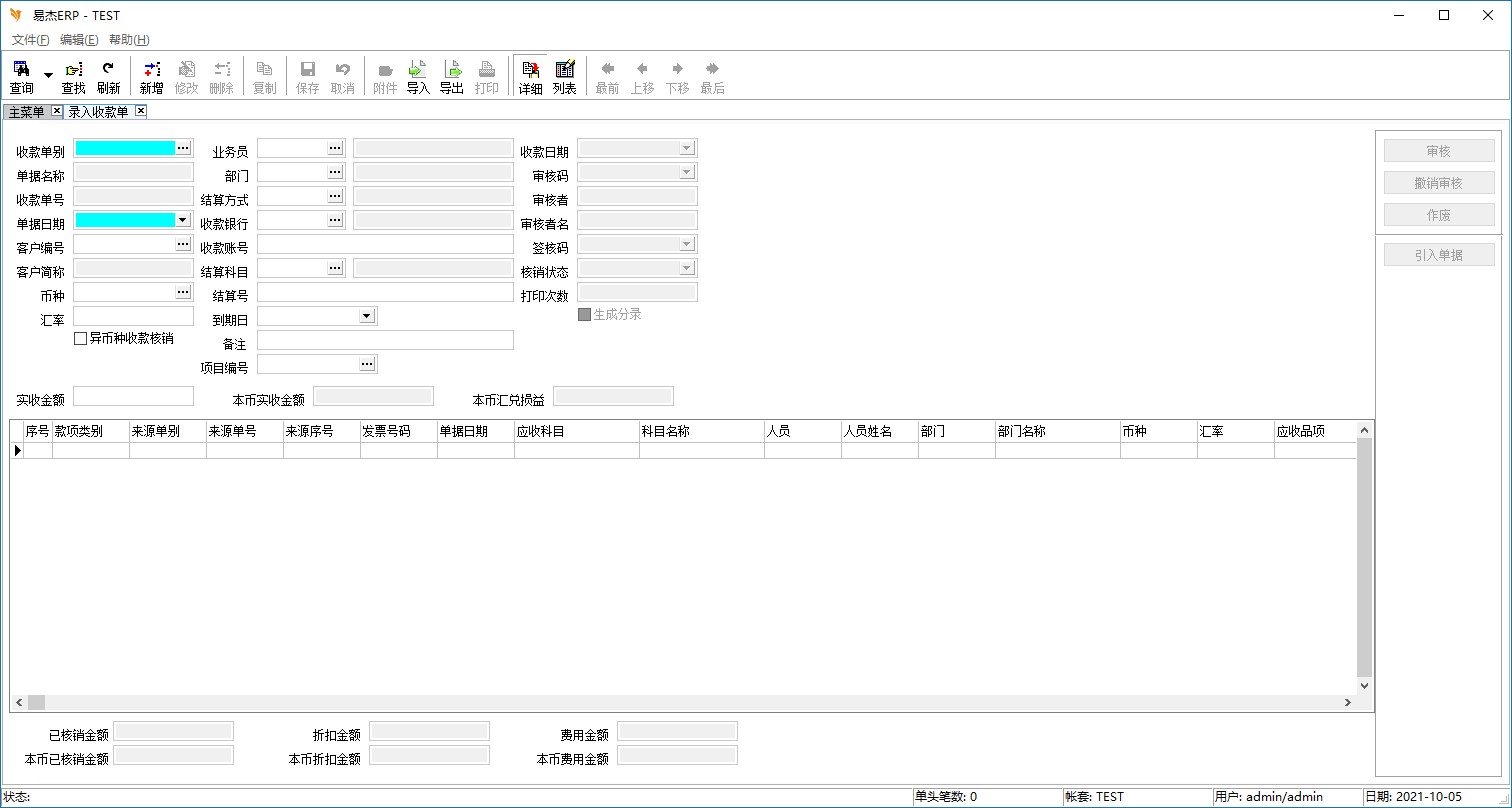 款项类别(TL004) = 9.其他费用,单据日期(TL009),应收科目(TL010),人员编号(TL011),部门编号(TL012),备注(TL023),项目编号(TL024)显示,其他字段都不显示,单据日期(TL009),应收科目(TL010),币种(TL013),汇率(TL014) 不可空白;如果异币种收款核销(TK031) 币种(TL013),汇率(TL014)不显示.