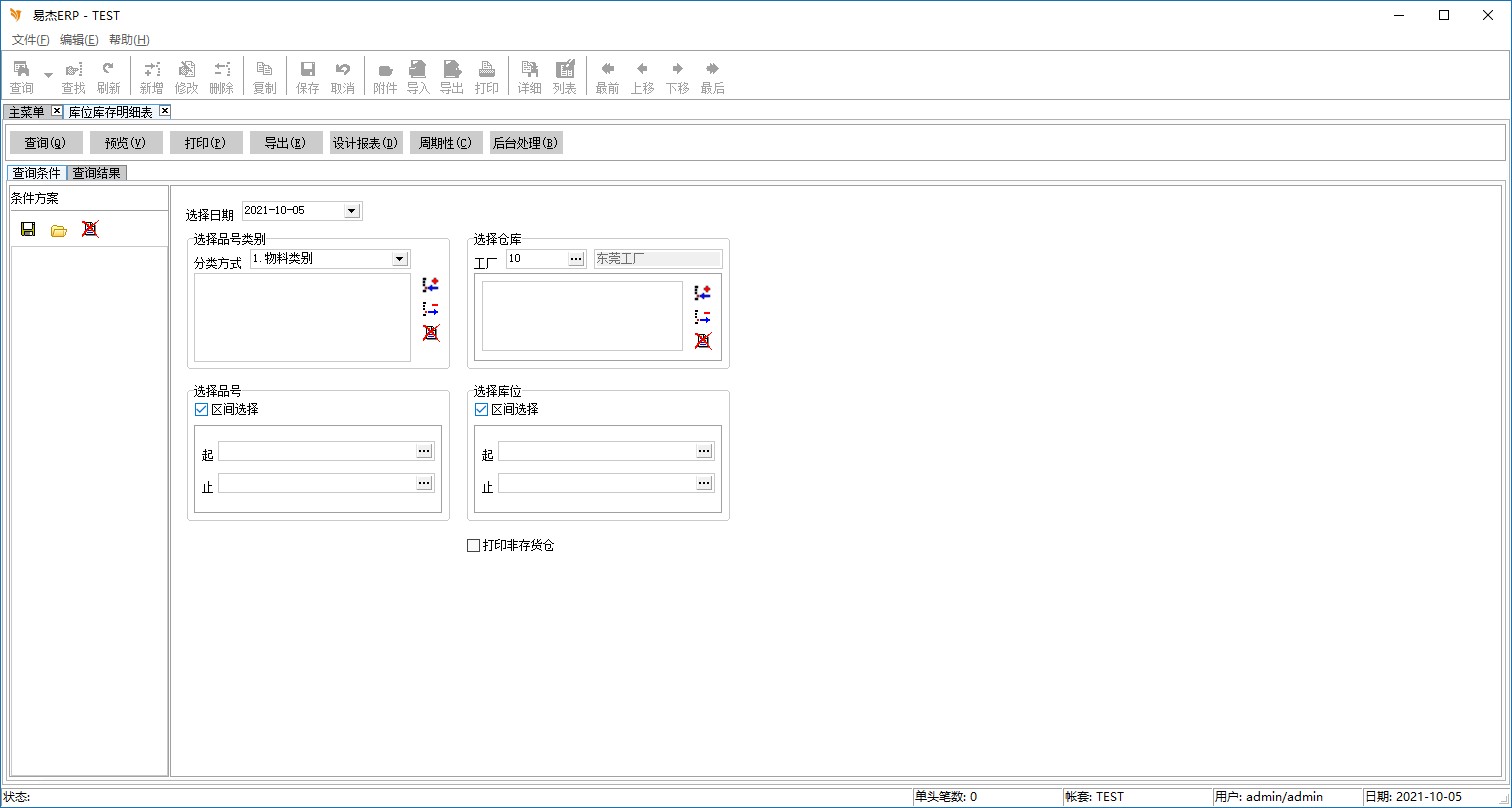 - 打印每一特定时间日各项品号存放在各库库位的库存数量,库存金额及单位成本等的统计信息。