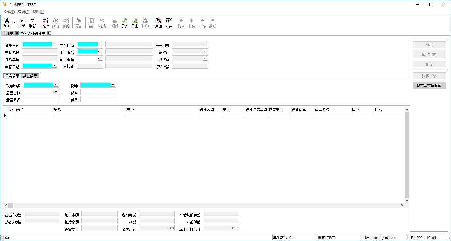 • 可以输入,查询或删改委外进货单信息,并可作进货审核或撤销审核。