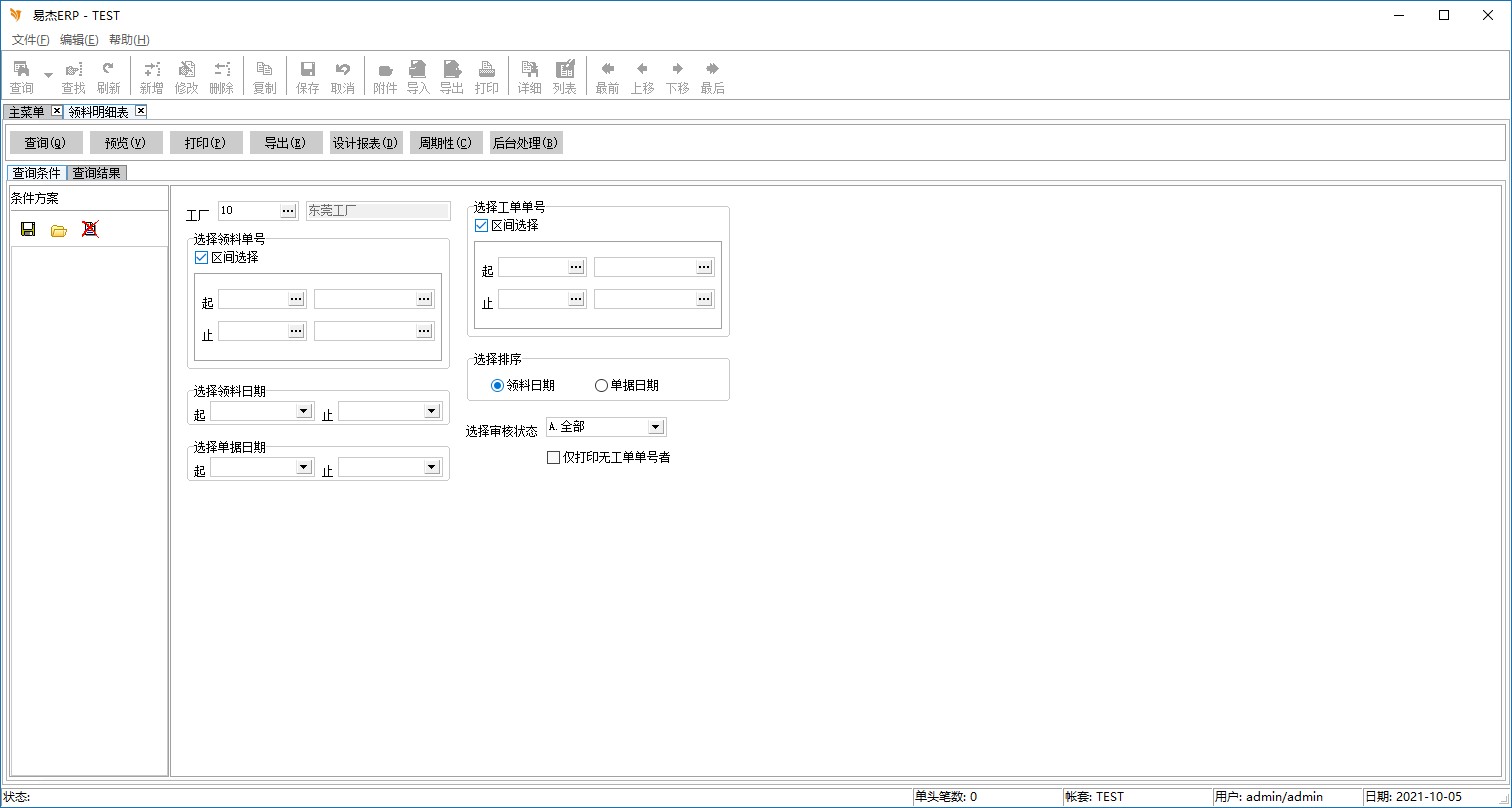 可以选择需要打印的领料编号,空白表全部信息.可按[F2]查询领料编号,并仅能输入单据性质为『54』(厂内领料)或『55』(委外领料)的信息。