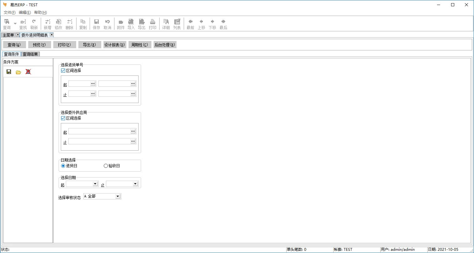排序: (1).当日期选择「委外进货日」时,按进货日期+单别+单号排序打印。 (2).当日期选择「验收日」时,按验收日期+单别+单号排序打印。