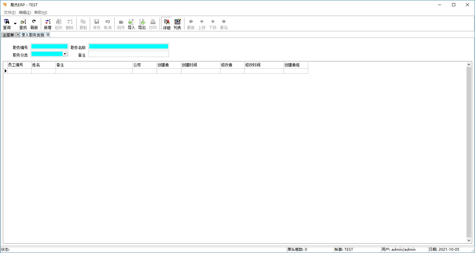 树状主菜单中选择 系统管理子系统->基础设置->录入职务类别,出现如下画面: