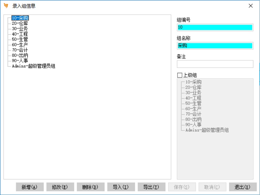 创建五个组别:10 销售组、20 生管组、30 采购组、40 仓管组、50 工程组