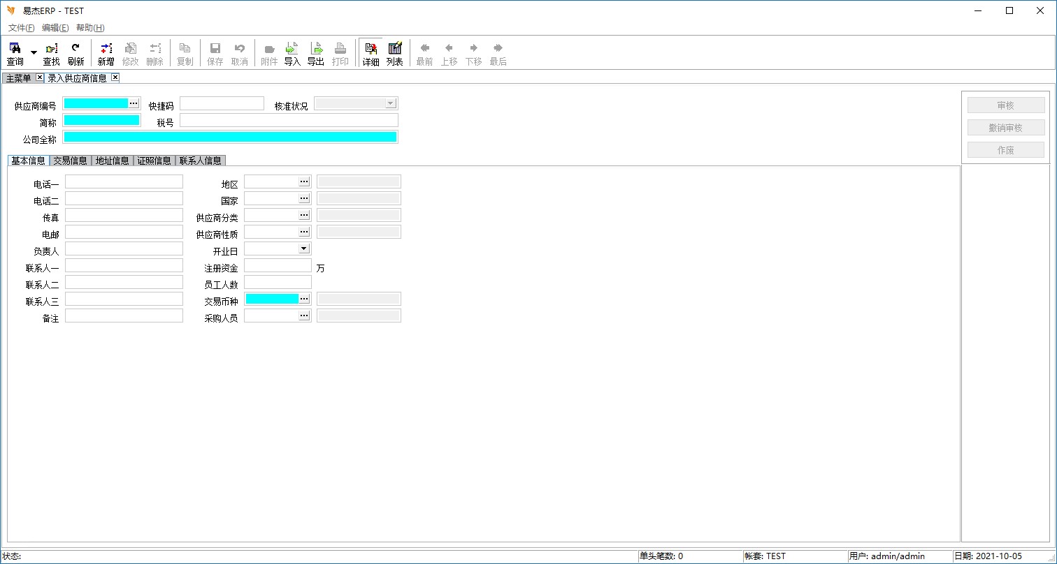 树状主菜单中选择 采购管理子系统->供应商管理->录入供应商信息,出现如下画面: